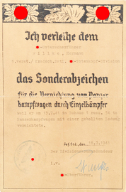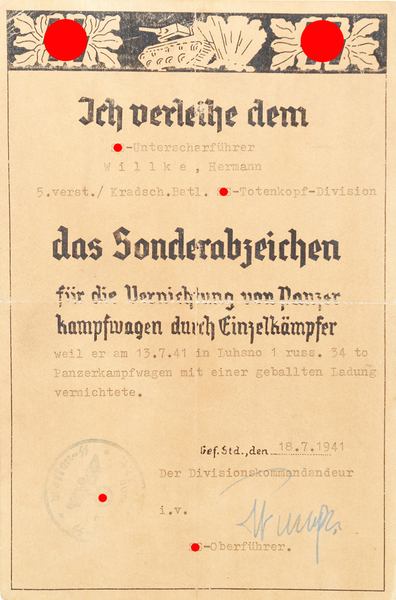 SS-Schmuckblatt-Urkunde zum Sonderabzeichen für die Vernichtung von Panzerkampfwagen der SS-Totenkopf-Division.