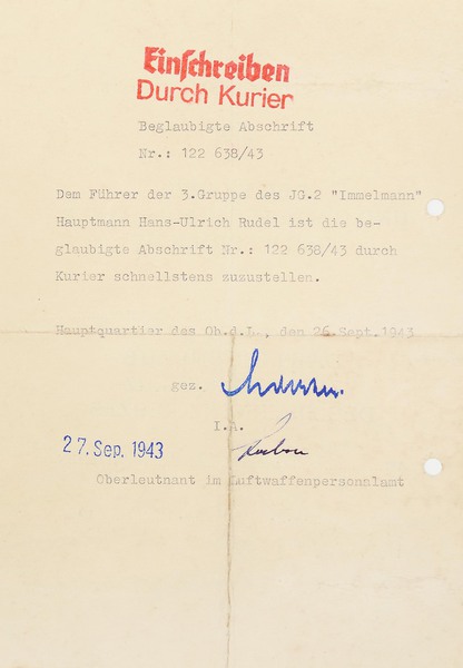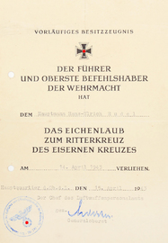 Vorlaufiges Besitzzeugnis zum Eichenlaub zum Ritterkreuz des Eisernen Kreuzes an